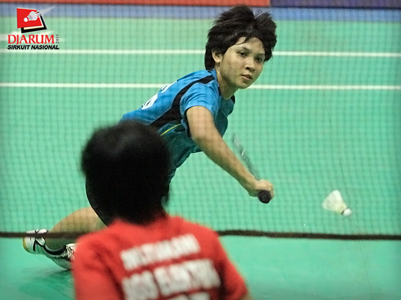 Pemain PB 21 Jakarta, Melisia Kurniawan berusaha mengembalikan kok ke arah pemain PB Tangkas Alfamart, Natalia Dieske dalam laga penyisihan Djarum Sirkuit Nasional Pangkalpinang di GOR Kacang Pedang, Kota Pangkalpinang, Rabu (21/9).