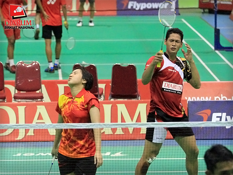 Ekspresi kecewa pasangan Rizky Yanu/Lita Nurlita usai kandas di tangan pasangan Ridho Akbar/Eri Oktaviani dalam laga ronde pertama ganda campuran Djarum Sirkuit Nasional Pangkalpinang di GOR Kacang Pedang, Kota Pangkalpinang, Rabu (21/9).