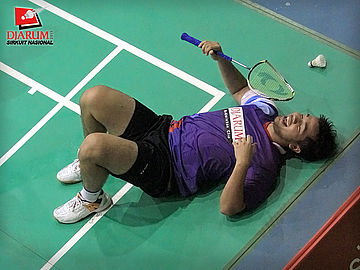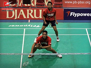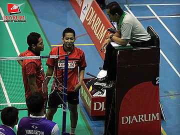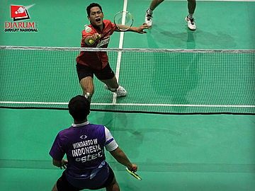 Pemain PB Djarum, Fernando Kurniawan (bawah) terjatuh ketika tengah berlaga kontra rekan setimnya di PB Djarum, Albert Saputra/Rizki Yanu Kresnayandi di babak semifinal Sirkuit Nasional Pangkalpinang di GOR Kacang Pedang, Pangkalpinang, Jumat (23/9).