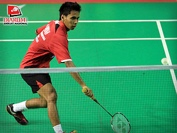 Pemain Pertamina, Alamsyah Yunus berusaha mengembalikan kok ke arah pemain Surya Baja, Hadi Husein dalam babak penyisihan tunggal dewasa putra Djarum Sirkuit