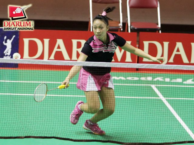 Dinar Dyah (PB Djarum Kudus) menyambut serve dari Melicia Lumiawan (PB 21 Jakarta).