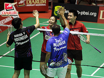 Pasangan ganda campuran dewasa, Trikus Harjanto/Vita Marissa (bawah) bersalaman dengan pasangan Rendra Wijaya/Tika Permatasari (atas) usai bertanding.