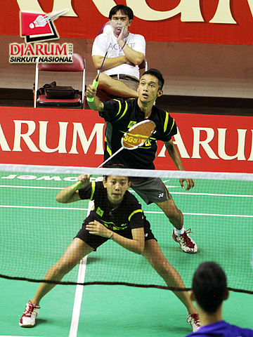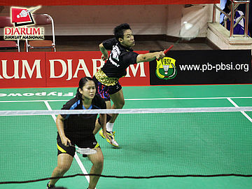 Pasangan Rendra Wijaya/Tika Permatasari (PB Djarum Kudus/SGS PLN) bersiap menyambar bola tanggung yang dilepaskan pasangan Trikus Harjanto/Vita Marissa (Pertamina Indonesia/Tangkas Specs).