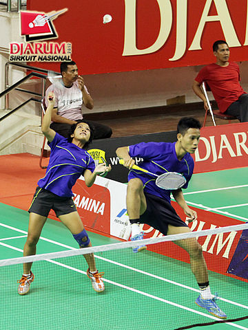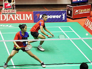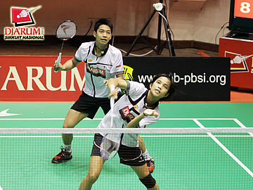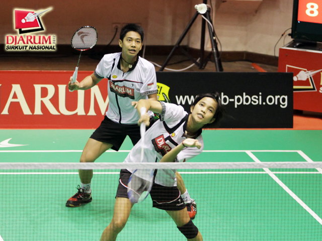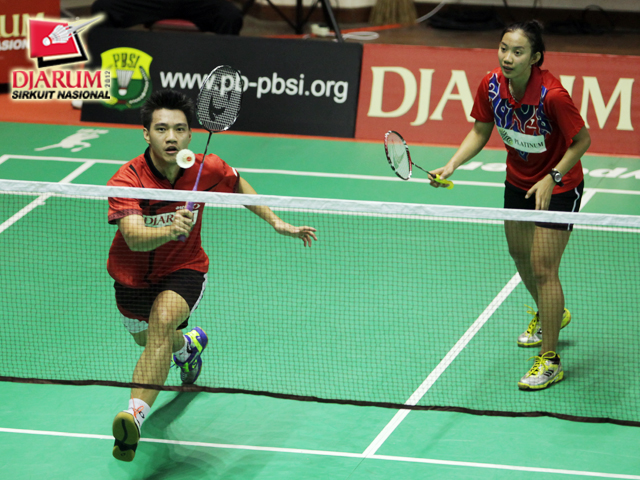 Pasangan I Putu Roy/Berliyan Sudrajat (Gemilang Surabaya/Semen Gersik) berusaha mengembalikan bola ke arah pasangan Ricky Alverino/Febriani Endar (PB Djarum Kudus).