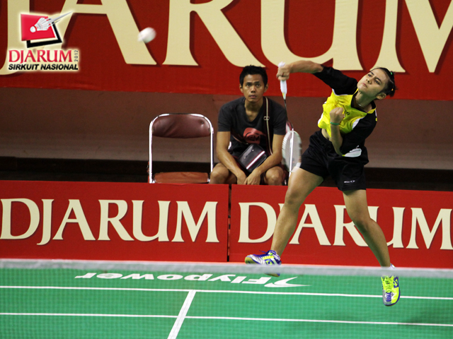Dinar Dyah (PB Djarum Kudus) berhasil mengembalikan smash menyilang dari Ana Rovita (PB Djarum Kudus).