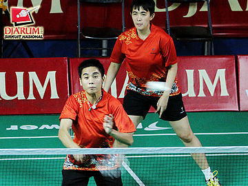 Bandar Sigit Pamungkas (Djarum Kudus) sedang memukul kok untuk dikembalikan kepada Gestano G. Adwidya (Tangkas Specs).