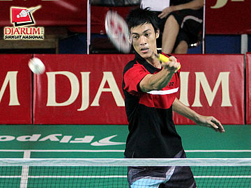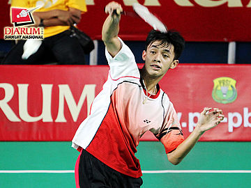 Thomi Azizan Mahbub (Djarum Kudus) sedang mengembalikan kok kepada Shesar Hiren Rhustavito (Pelatnas).