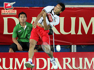 Febrian Irfanaldy (Hi Qua Wima) sedang memukul kok untuk dikembalikan kepada Hermansyah (Pusdiklat Jaya Raya).