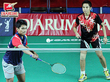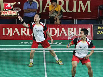 Pasangan ganda dewasa putra dari SGS PLN, Imam Sodikin dan Ujang Suherlan yang sedang berhadapan dengan pasangan Rangga Yove Rianto / Seiko Wahyu Kusdianto (Djarum Kudus).