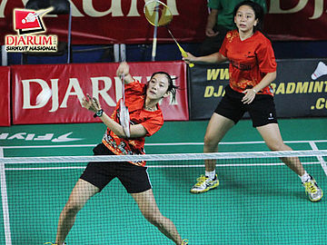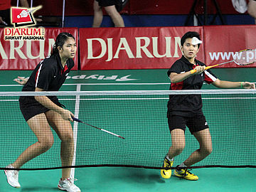 Natalia Deiske yang berpasangan dengan Novalia Agustianti (Tangkas Specs) sedang mengembalikan kok kepada pasangan Aan Dwi C / Mega Cahya Purnama (Hi Qua Wima).