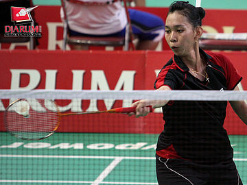 Pemain Jaya Raya Suryanaga, Tike Arieda Ningrum berusaha mengembalikan kok ke arah pemain Mutiara Bandung, Hanna Ramadini .