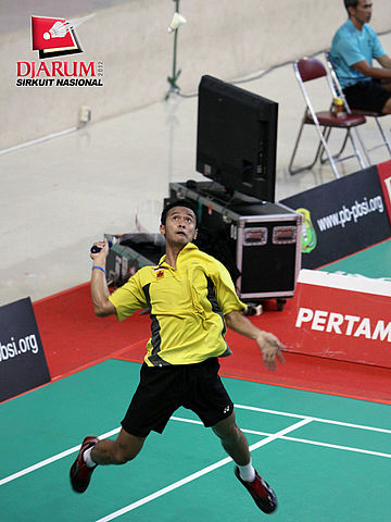 Pemain SGS PLN Bandung, Flandy Limpele berusaha mengembalikan kok ke arah pasangan Jaya Raya Suryanaga, Hendra Setyo/Tri Kusuma.