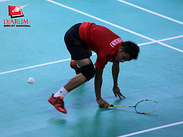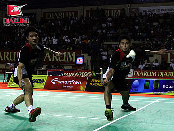 Pasangan asal PB Djarum, Dandi/Wifqi berusaha mengembalikan kok ke arah pasangan Chrisna/Ridho Akbar.