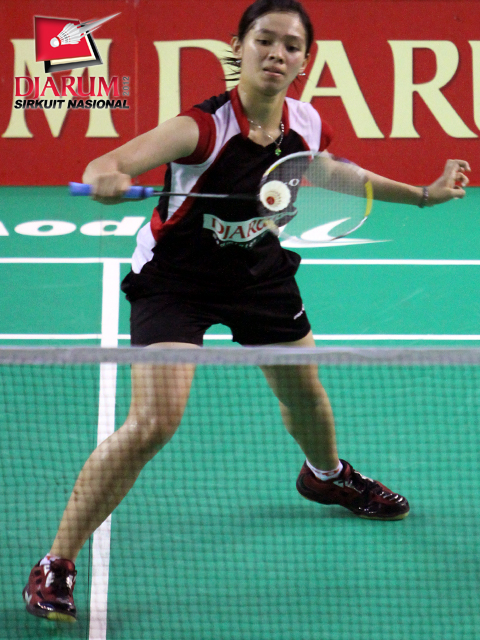Pasangan asal SGS PLN Bandung, Devi Tika Permatasari/Keshya Nurvita berusaha mengembalikan kok ke arah pasangan Pusdiklat Jaya Raya, Aris Budiharti/Dian Fitriani