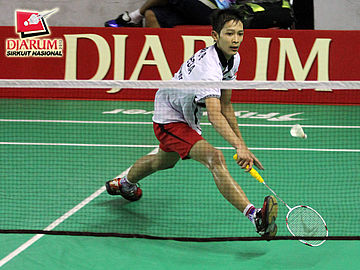Bayu Pangisthu (PB Djarum Kudus) berusaha mengembalikan bola kepada Setyaldi Putra (Guna Dharma).