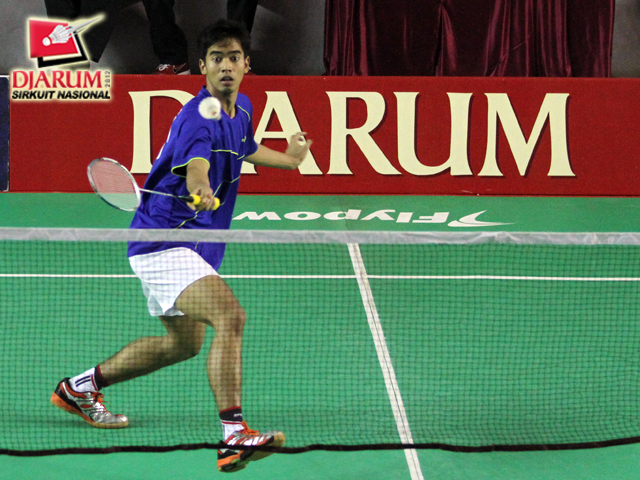 Thomi Azizan (PB Djarum Kudus) berusaha mengembalikan bola ke arah Gesstano Ganendra (Tangkas Specs).