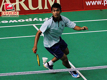 Andreas Adityawarman (Djarum Kudus) sedang memukul bola