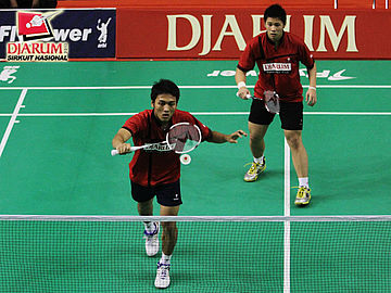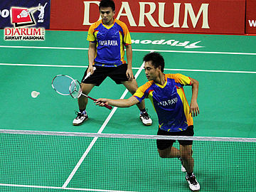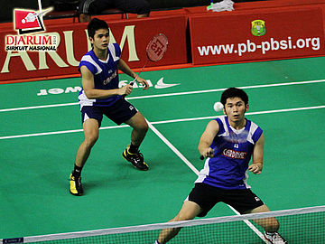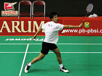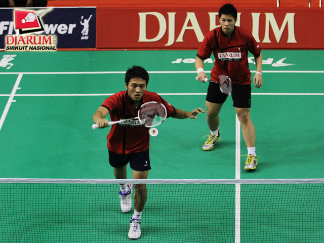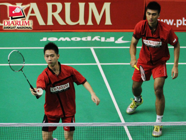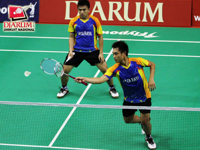 Arsya Isnanu Adi Putra yang berpasangan dengan Hantoro (Djarum Kudus) sedang mengembalikan kok untuk dikembalikan kepada pasangan Andrio Salmonco/ Septian Eka P (Jaya Raya Jakarta).