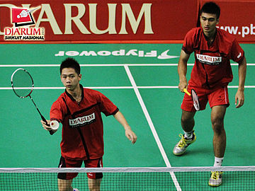 Kevin Sanjaya Sukamuljo yang berpasangan dengan Rafiddias Akhdan Nugroho (Djarum Kudus) sedang memukul kok untuk dikembalikan kepada pasangan Bagus Haryanto/ Firman Ramadhan (Mutiara Bandung).