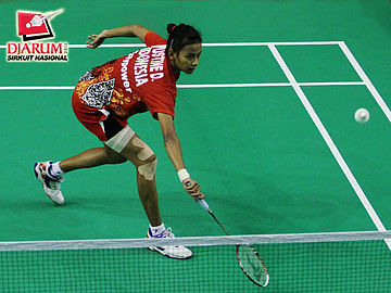 Dinar Dyah Ayustine (Djarum Kudus) sedang berusaha mengembalikan kok untuk dikembalikan kepada Ganis Nurrahmadani (Pertamina Indonesia) pada perempatan final