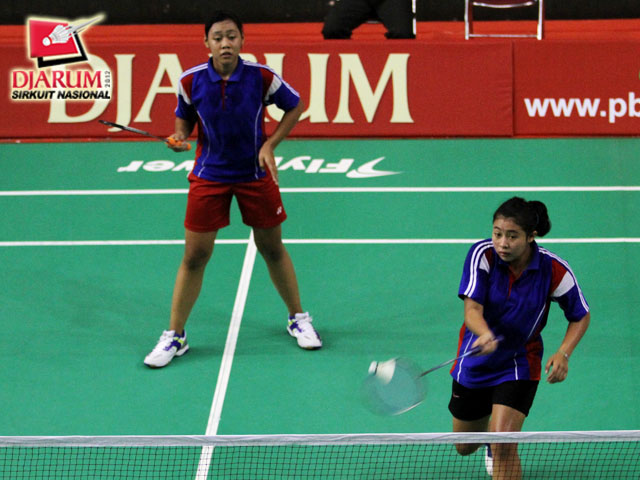 Iga Chusnul Aziza yang berpasangan dengan Riska Ayu Indah Sari (Bayu Kencana) sedang memukul kok untuk dikembalikan kepada pasangan Priskila SIahaya/ Shinta Dwi Herliyanti (Exist).