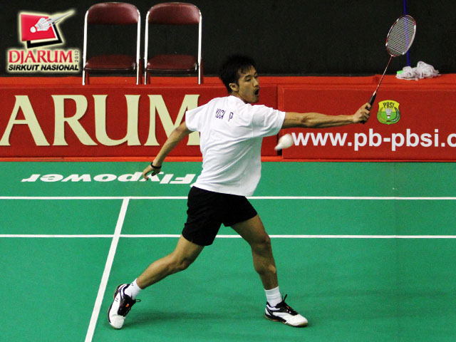 Agi Hariawan Suyitno (Surya Baja) sedang berusaha mengembalikan kok kepada lawannya, Ihsan Maulana Mustofa (Djarum Kudus).