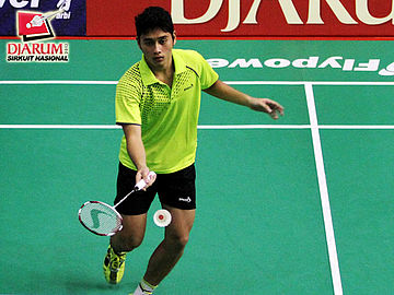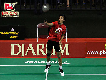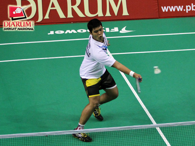 Bandar Sigit Pamungkas (Djarum Kudus) sedang mengembalikan kok kepada lawannya, I Putu Roy Danu sedang (Gemilang Surabaya).