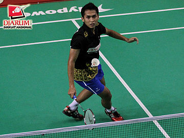 Rico Hamdani (Tangkas Specs) sedang memukul kok kepada lawannya, Setyaldi (Guna Dharma).