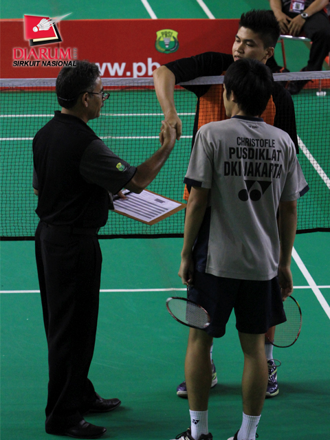 Pemain PBSI Medan Teguh Putra bersalaman dengan referee usai pertandingan melawan pemain Pelatprov DKI Christofle Brians. Dalam pertandingan tersebut, Teguh kalah 13-21 dan 12-21 dari Christofle.