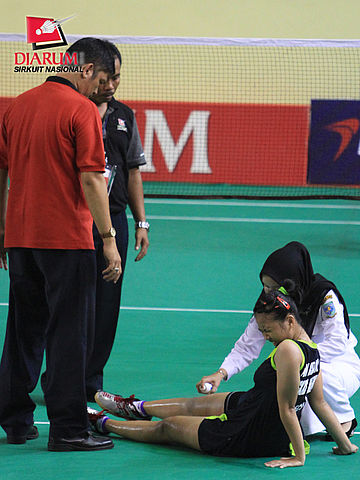 Tim medis sedang memberikan pengobatan kepada pemain Tangkas Alfamart, Rusydina Antardayu Riodingin.