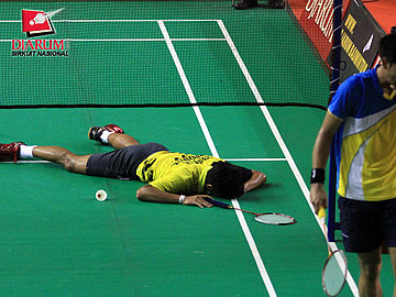 Hermansyah dari Jaya Raya Jakarta jatuh tersungkur saat berusaha mengembalikan kok ke Gestano Ganendra dari Tangkas Alfamart.