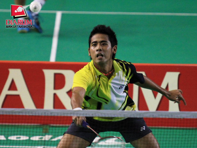 Hermansyah, pemain Jaya Raya Jakarta memukul kok dengan keras ke arah pemain Tangkas Alfamart, Gestano Ganendra.