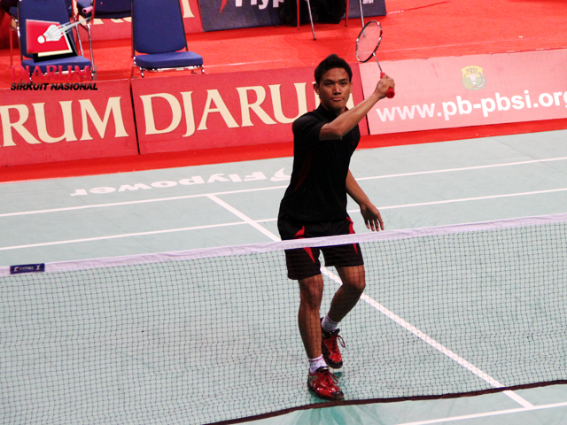 Tuan rumah, Zulpikar (HIKMA Makassar), Sedang Menghadapi Pemain dari Jakarta, Jonathan Christie (Tangkas Alfamart Jakarta)