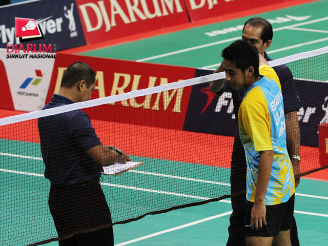 Hermansyah (Pusdiklat Jaya Raya) bersalaman dengan wasit usai dinyatakan menang walk out atas pemain PBSI Sulbar, Rizal.