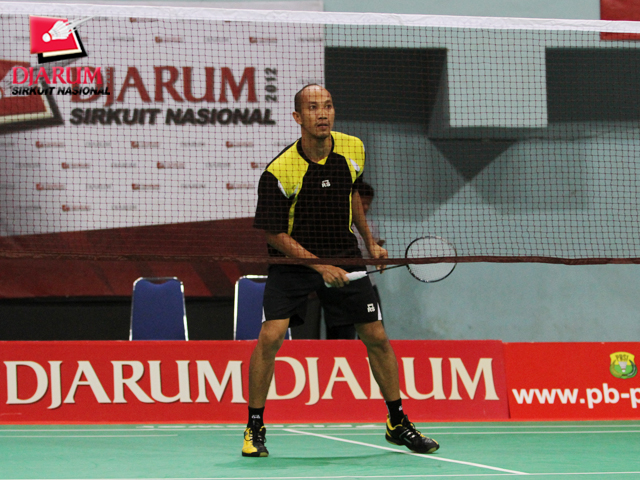 Jeffer Rosobin (Rosobin Jakarta) berhadapan kontra M. Junaedi (Pelabuhan II) di babak pertama tunggal putra Djarum Sirkuit Nasional Sulawesi Selatan Open 2012.