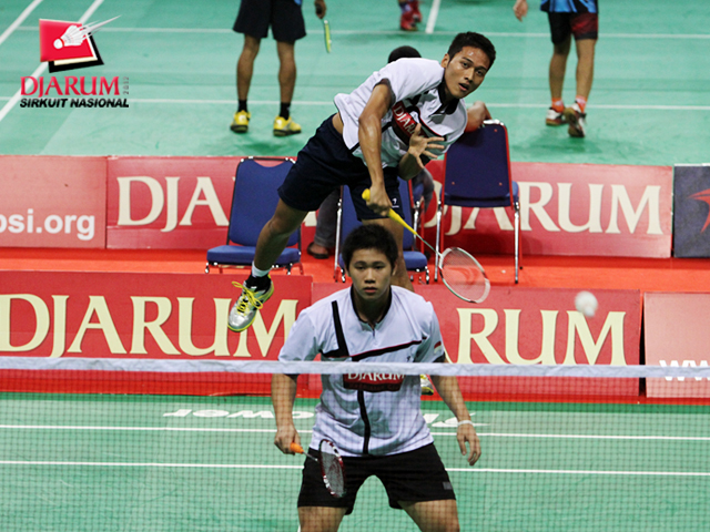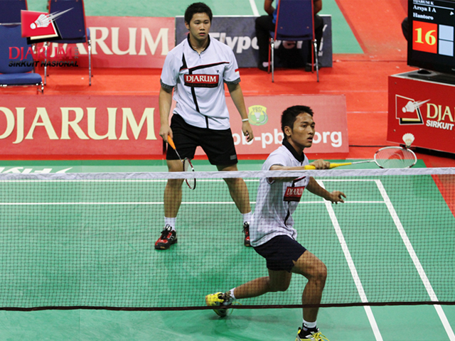 Arsya Isnanu Ardi Putra/Hantoro (Djarum Kudus) berusaha mengembalikan kok ke arah pasangan M. Nur Kaffi/Yusuf (Pusdiklat Hevindo Balikpapan)