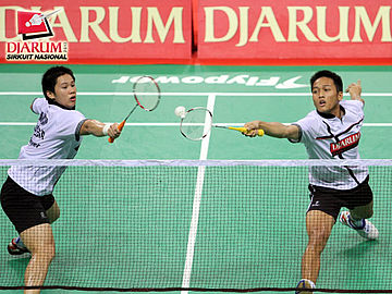 Pasangan Arsya Isnanu Ardi Putra/Hantoro (Djarum Kudus) berusaha mengembalikan kok ke arah pasangan R.E.F/Rian S (Pusdiklat Jaya Raya)