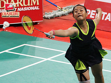 Rusyidina Antardayu (Tangkas Alfamart Jakarta) berusaha mengembalikan kok ke arah Rizky Amelia (Pusdiklat Raya Jakarta)