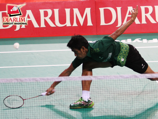 Adi Pratama (Pusdiklat Raya Jakarta) berusaha mengembalikan kok ke arah Christofle Brians (Pelatprov DKI)