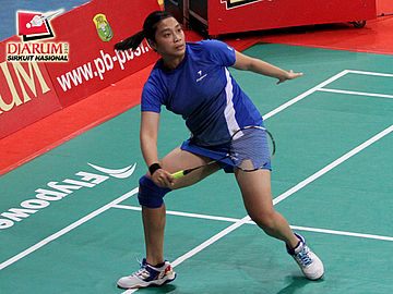 Novalia Agustianti (Tangkas Alfamart Jakarta) berusaha mengembalikan kok ke arah Pia Zebadiah (Pusdiklat jaya Raya Jakarta)