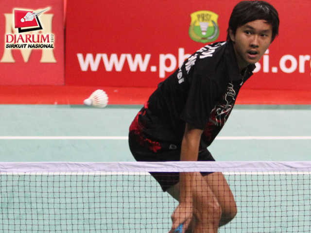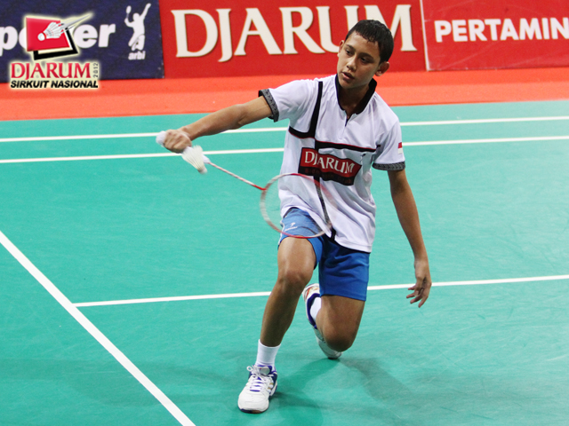 Dheva Anri Musthi (SCW Medan) berusaha mengembalikan kok ke arah Fauzi Ramadhan (Djarum Kudus)