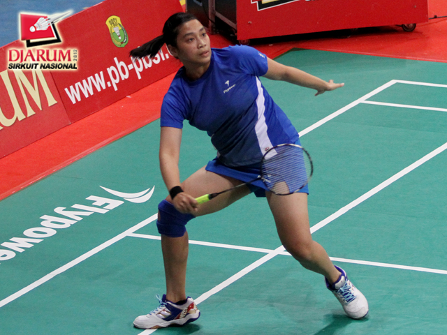 Pia Zebadiah (Pusdiklat Jaya Raya Jakarta) berusaha mengembalikan kok ke arah Novalia Agustianti (Tangkas Alfamart Jakarta)