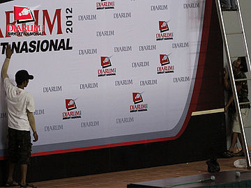 Panitia mempersiapkan backdrop Djarum Sirnas Palembang 2012 di GOR Dempo.