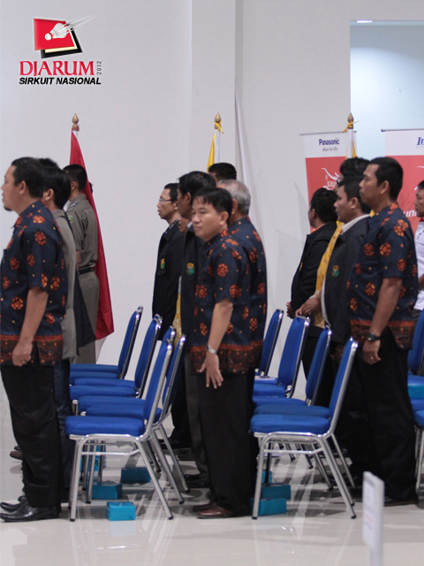 Para tamu undangan pembukaan Djarum Sirnas Palembang 2012 berdiri saat lagu Indonesia Raya akan dikumandangkan.