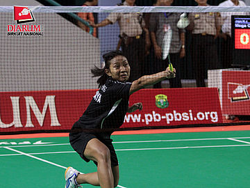 Gibertha Agnestia Suhendra yang berpasangan dengan Farah Amalia Triyani (PB Djarum) sedang berusaha mengembalikan bola dalam pertandingan melawan Ayu Wanda/Neng Wulan dari PB Exist Jakarta.