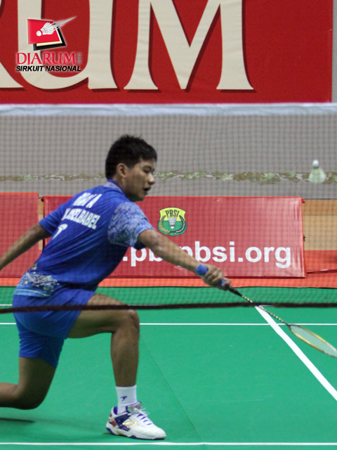 Ekspresi Ahmad Rivai (PB Bank Sumsel Babel ) yang penuh semangat saat bertanding melawan Ramli dari PB KAI di nomor tunggal dewasa putra. Ahmad Rivai keluar sebagai pemenang dengan skor 21-7/21-5.