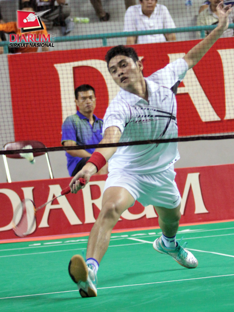 Alamsyah, pemain Pertamina Indonesia terpeleset saat mengembalikan bola dari Andreas Adityawarman, pemain PB Djarum dalam pertandingan Tunggal Dewasa Putra ronde ketiga yang berlangsung Kamis, (22/3).