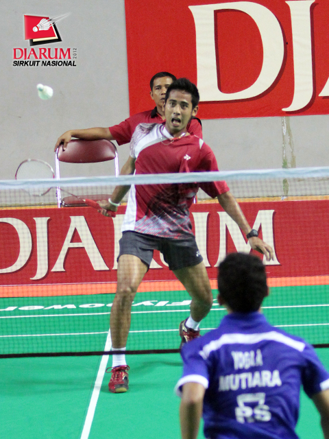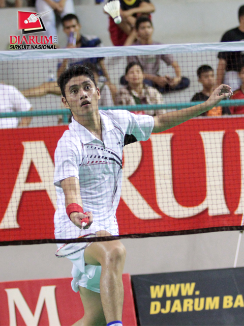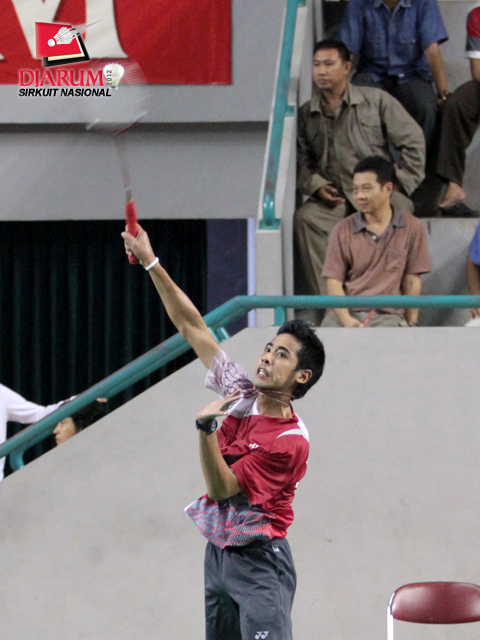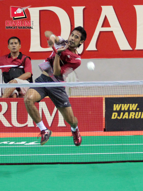 Pemain Pertamina Indonesia, Alamsyah Yunus yang menjadi unggulan pertama Tunggal Dewasa Putra sedang melakukan smash ke arah lawannya, Adityawarman dari PB Djarum. Alamsyah memenangkan pertandingan dengan perolehan skor 21-13/21-19.