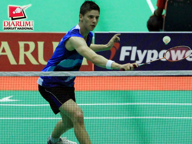 Mirco Parschau, pemain asal Jerman, dalam posisi siap mengembalikan kok kepada lawannya, Yohanes Hendry Aprilianto dari SGS PLN.