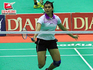 Elizabeth Matindas (SGS PLN) sedang mengembalikan kok kepada Marsa Indah Salsabila (Djarum Kudus).